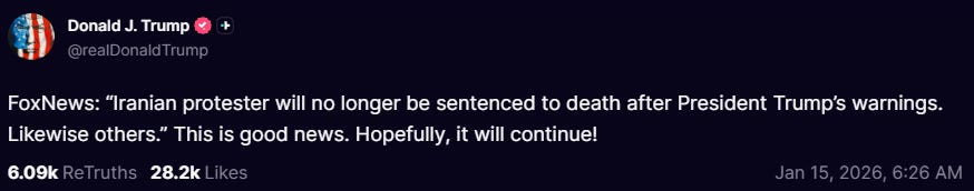 Days after threatening military action against Iran over its brutal treatment of protesters, Donald Trump is stepping back from the brink. The Treasury Department is instead implementing new sanctions on Iranian officials responsible for the crackdown, while Trump himself is suggesting Iran might be mending its ways: