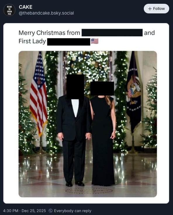 GET A LIFE: It wouldn’t be a holiday if the Trump administration weren’t posting AI/animated videos deifying Trump or celebrating the rounding up of immigrants. This Christmas provided a bounty offensive material. There was the Department of Homeland Security posting an AI video depicting Santa as an ICE agent—ho ho horrible! There was another DHS video with the title: “We are blessed to share a nation and a Savior.” That one was probably offensive to the non-Christians in America who don’t share that Savior. It also featured six separate shots of Donald Trump (presumably the Savior), one of Melania Trump, and a call for all to “Celebrate our Homeland.” Subtle stuff!