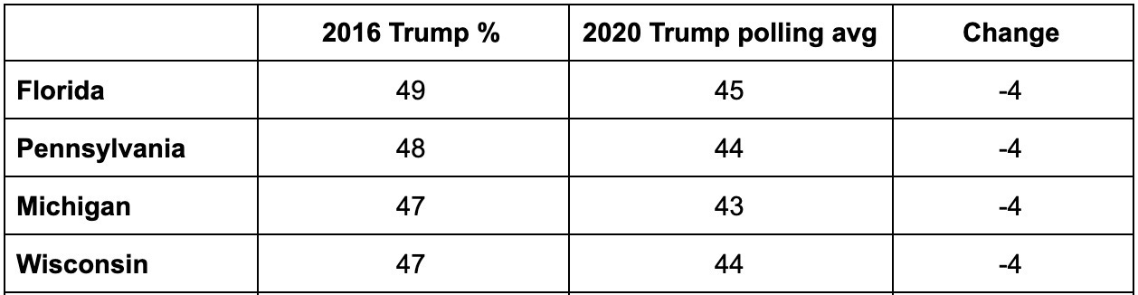So if Trump’s national numbers are down and his numbers with many demographic groups are down, then we’d expect to see him losing ground in state polling, too.