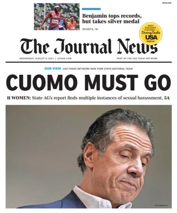 The reaction to the Cuomo Report highlights the political/media asymmetry in our political scandals. Unlike Republicans with Trump, Democrats have turned en masse against Cuomo, who has no JimJordan/MattGaetz/LindseyGraham/RonJohnson/KevinMcCarthy claque to rush to his support. Democrats have decided that he is now a political liability and seem anxious to jettison him before the 2022 election.