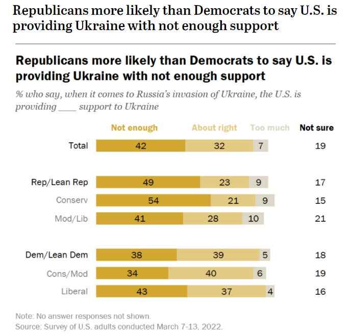 Perhaps the confusion reflects the shift in the GOP base, which continues to disapprove of most anything President Biden does, but wants a more robust response to the Russian invasion. Here are the latest Pew numbers: