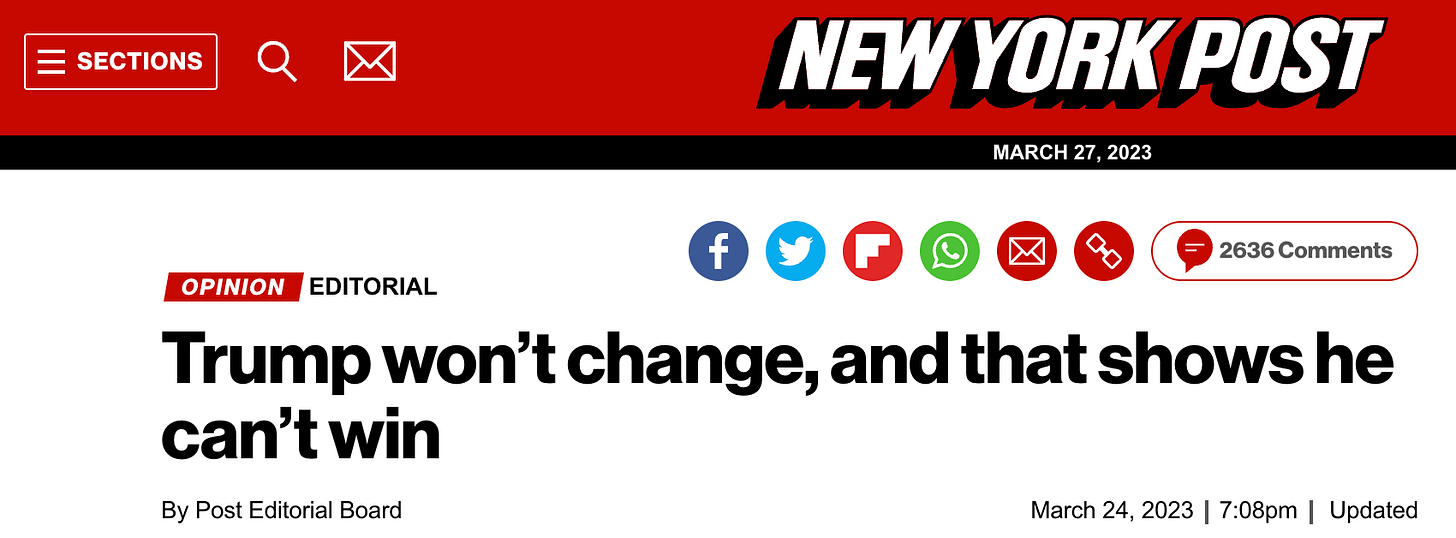 That’s what Rupert Murdoch the NY Post editorial board thinks. They surveyed the entire list of horribles that Charlie went through this morning—the Very Fine People, the impeachments, the insurrection, the dinner with the neo-Nazi virgin, the call to overturn the Constitution, the incitement of violence, the praise of Putin and Xi—and concluded that they should reject Donald Trump and all his works . . .