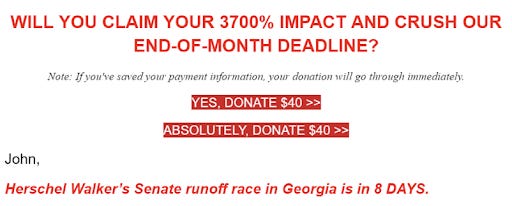 A FEW DAYS BEFORE the Senate runoff election in Georgia between Raphael Warnock and Herschel Walker, the Republican National Committee sent around what would, in a sane world, qualify as an exceedingly peculiar email. The message gave the recipient a “DEADLINE” of “1 HOUR” to contribute money to a “Flip Georgia Fund.” Those who met the “DEADLINE” by parting with at least $25 in the “NEXT HOUR” would obtain a “3400% IMPACT INCREASE” for their trouble. It was “going to take a TEAM effort,” the email said, to “punt Raphael Warnock from the Senate and SAVE America.”