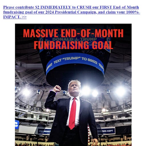 During the 2020 election, Republican fundraising emails regularly contained pre-checked boxes, often buried beneath many lines of bold and all-caps text, that doubled a contributor’s payment, or that made the payment automatically recur (sometimes weekly), or that did both. Largely thanks to tactics like these, the Trump campaign wound up issuing $122 million in refunds. (The pertinent digital consultancy kept its cut—around four percent—of these returned donations.) After Trump lost, his outfit collected $250 million for an “Official Election Defense Fund” that did not exist. And these days, almost all of the GOP’s pleas for cash feature apocalyptic rhetoric (“the fate of America is in your hands”), bogus deadlines (“I only have until midnight tonight to hit my goal”), make-believe donation matches (3,400 percent is not the highest one out there), juvenile guilt trips (“If you UNCHECK this box, we will have to tell Trump you’re a DEFECTOR”), and various other deceits and histrionics. As Tim Miller puts it, the Republican party “has turned into one big off-shore call center trying to trick granny into handing over their credit card number to pay for some phony life insurance.”