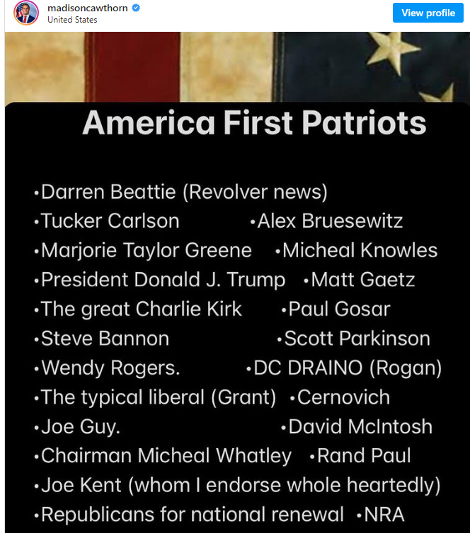 Cawthorn helpfully provides a list; and it is everything you’d hope it would be. Lunatics, grifters, conspiracy theorists, white nationalists, crackpots — all the usual suspects, including Steve Bannon, Tucker Carlson, “the great” Charlie Kirk, Marjorie Taylor Greene, and, of course, the former president of the United States: