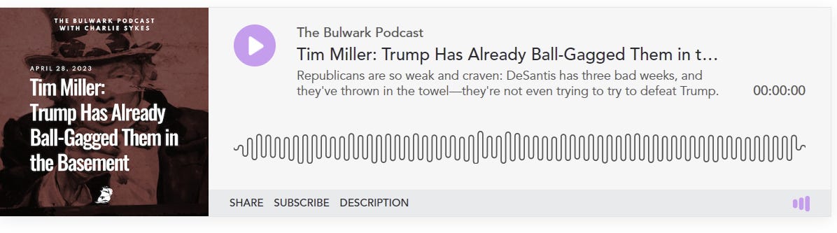 On our weekend podcast Tim Miller and I discussed the pre-emptive surrender of the GOP: DeSantis has three bad weeks, and they’ve thrown in the towel—they’re not even trying to try to defeat Trump. Plus, Disney reminds conservatives they’re supposed to like smaller government, and Tucker is even worse in private.