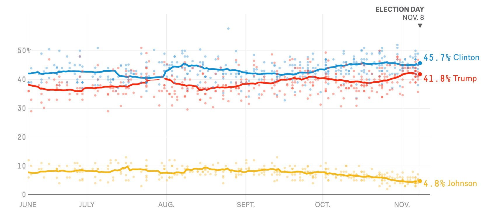 Relative to 2020, the 2016 race was more volatile. There were moments when Clinton and Trump were tied; moments when Trump was in the lead; moments when Clinton's lead was large (+8), and moments when Clinton's lead was within the margin of error.