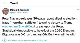 "The 'Justice' Department& the FBI have done nothing about the 2020 Presidential Election Voter Fraud, the biggest SCAM in our nation's history despite overwhelming evidence. They should be ashamed. History will remember. Never give up. See everyone in DC on January 6th"(Dec. 26)