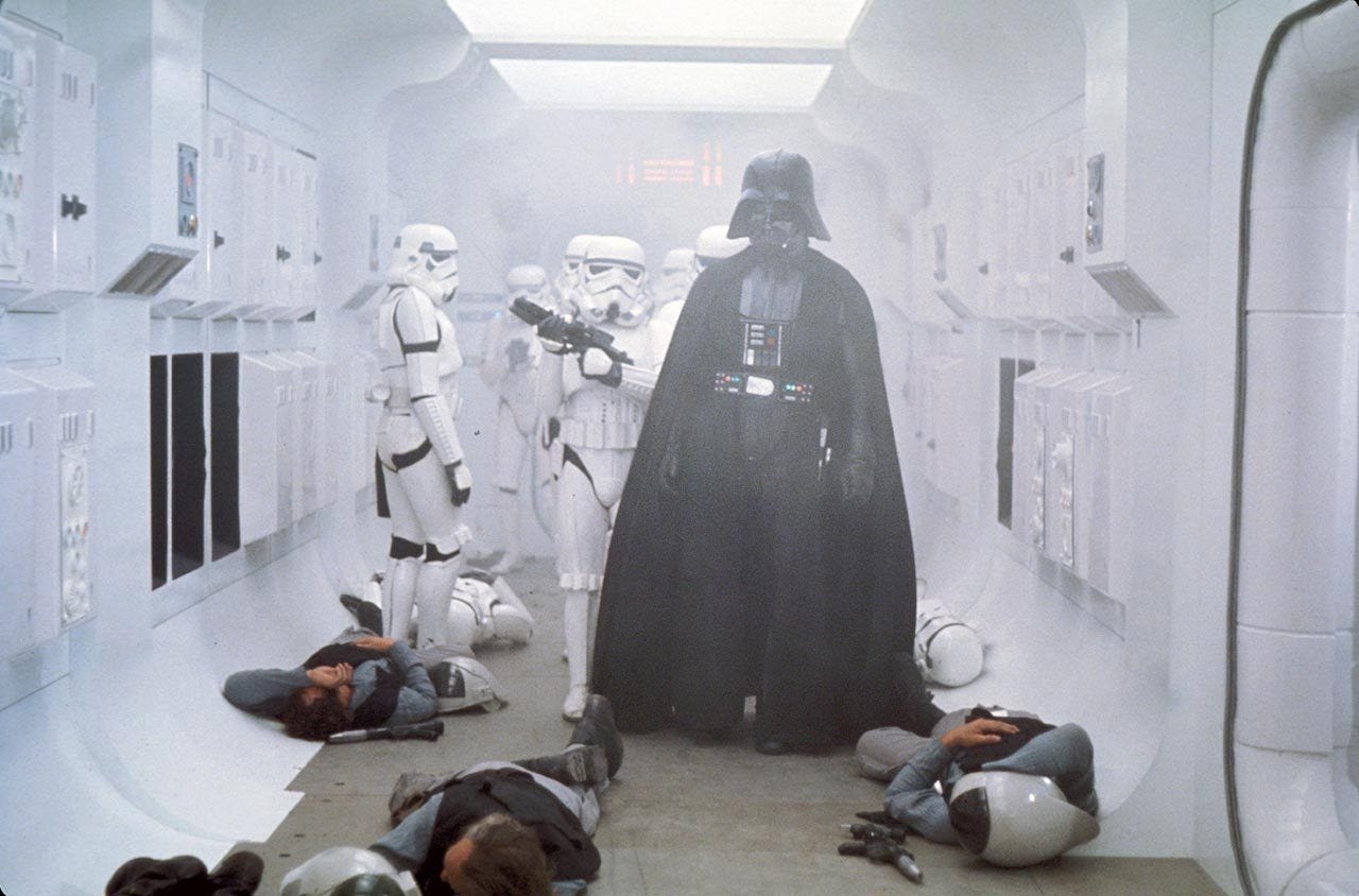 That said, if we’re just going to thunderously applaud while resting in our sleeping bags on the Capitol steps as liberty dies—wait, where have I heard this before—I’m going to take full advantage! Consider this my proposal for a CDC-mandated-and-enforced Moviegoer Bill of Human Rights, one that will protect the health and wellbeing of any individual who sets foot in a movie theater. As part of the CDC’s new extra-judicial regime, I and my team of stormtroopers (artist rendering above) will be going screen-to-screen to make sure that the people’s health is being protected from the scourge of shoddy movie presentation.