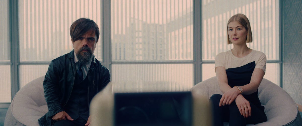 I Care a Lot does prominently feature the Russian mob; Grayson targets for control one Jennifer Peterson (Dianne Wiest), who, oopsy daisy, turns out to be the mother of Roman Lunyov (Peter Dinklage). Needless to say, he’s not too happy about the fact that his mother and her assets (which, obviously, are his assets) have come under the control of this vicious bureaucratic knife fighter. But are his guns and his goons any match for Grayson’s mastery of the judicial system?