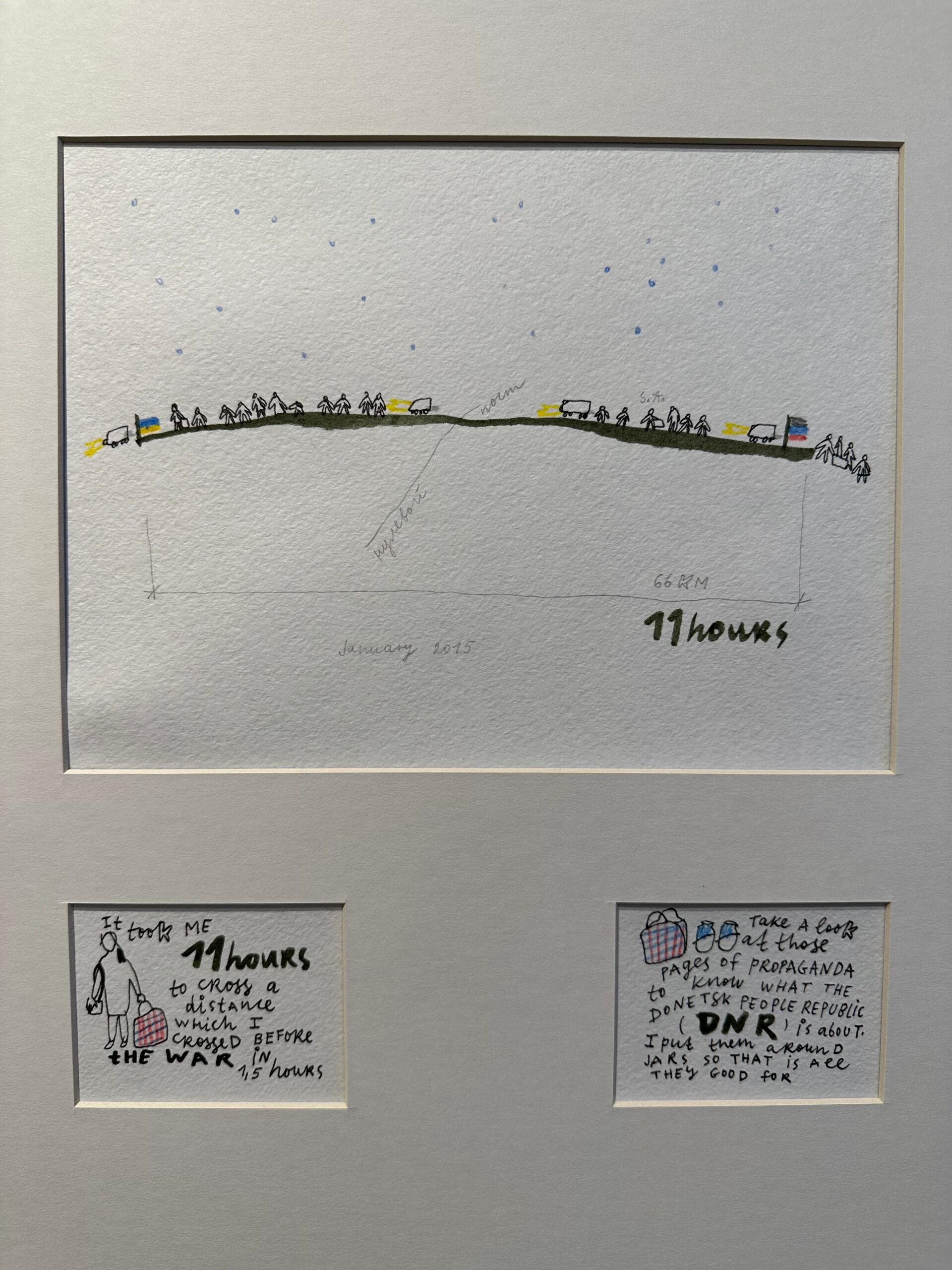 Snippets of these cemetery phone conversations are then illustrated by Kakhidze, offering intimate views of occupation life. For Strawberry, that life entailed an exhausting journey across the demarcation zone several times a month to collect her pension checks. About half a million retired Ukrainians live in the occupied territories, and they must face these regular trips into non-occupied territory to receive their government support.