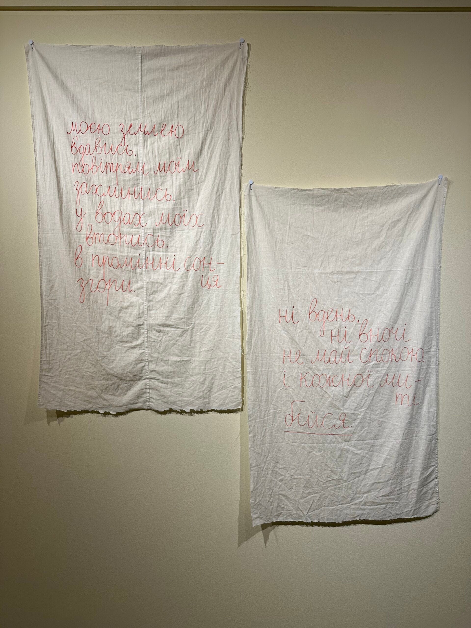 A set of Fedorova’s bedsheets faces visitors at one of the gallery’s main entrances. Lines of red marker twist across the white cloth, forming loops of Cyrillic cursive. These improvised canvases bear curses for the Russian soldiers invading her country. Translated to English, the poem reads: