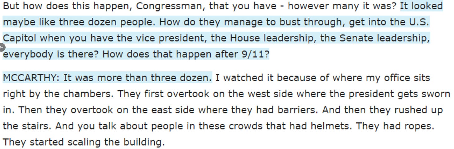 But that night, on the air, she lead with “ANTIFA sympathizers,” suggested that it was the work of “provocateurs,” and at one point suggested that the invasion of the Capitol involved only three dozen people. GOP Leader Kevin McCarthy corrected her: “It was more than three dozen.”