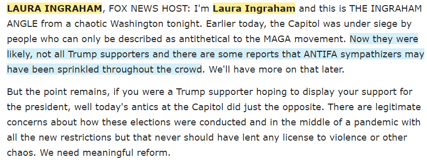 While Ingraham that afternoon called the attack “disgraceful” and said that “the president needs to tell everyone to leave the building,” later that night, she suggested on-air that some of the rioters might have been left-wing agitators rather than Trump supporters. “I have never seen Trump rally attendees wearing helmets, black helmets, brown helmets, black backpacks — the uniforms you saw in some of these crowd shots,” she said.