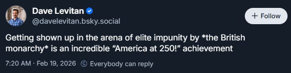 To dwell on the cheap shot for a moment. The Guardian is reporting King Charles was not given prior notice before his brother was arrested and apparently came as a surprise. Nevertheless the Mount-Batten family, King and Prince of Wales, have backed the investigation in their public statements. Now let’s contrast that to where our would be secret police killed two people on the streets of Minneapolis and the government apparently will not investigate nor turn over evidence to the state. The British just arrested the King’s brother, late in the story, for questioning while we won’t investigate the killing of our own citizens. What a way to celebrate 250 years of freedom.