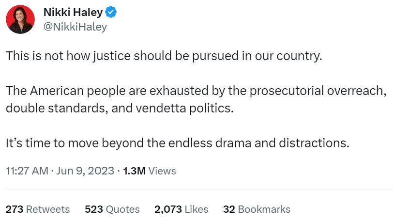 Former South Carolina Gov. Nikki Haley gave a master class in needle-threading this week. There’s no way Trump’s United Nations ambassador didn’t understand full well the security threat posed by his Mar-a-Lago hoarding antics. Still, her first instinct was to attack the indictment. Here is what she tweeted a couple of hours before the indictment was unsealed last Friday: