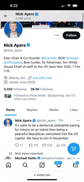This morning my wife informed me about a tweet from Nick Ayers, former good guy staffer of Mike Pence, making some typical alt right-pedophile-dem-and-the Republicans-were-peaceful-on-Jan-6 garbage message. Yet another one bites the dust. Nick Ayers was one of the good guys. But in the world of politics, campaign staff need money, and only the Trumpers are paying right now.