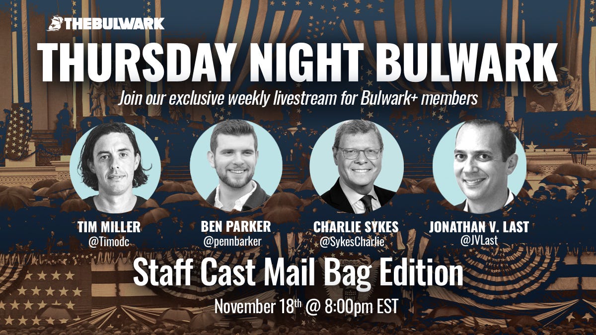 Bulwark+ TakesTNB Livestream: Mailbag Edition 11/18/21Nov 17, 2021∙ Paid42ShareOn this week's TNB, Charlie, JVL, Ben, and Tim take your questions. Was the QAnon Shaman’s penalty too harsh? Are the Democrats doing enough to save Democracy? Why is JVL so dark?This post is for paid subscribersJoinAlready a paid subscriber? Sign inPreviousNext