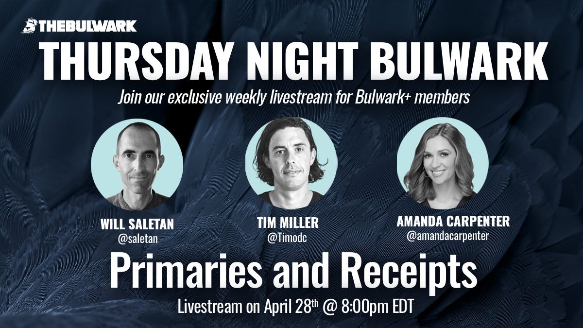 Will, Tim and Amanda headline this edition of Thursday Night Bulwark. They discuss the latest in the primaries, Speaker McCarthy’s fleeting crisis of conscience and Trump’s garbage men. Plus Mark Meadows’ texts—did everyone in DC have this guy’s cell phone.