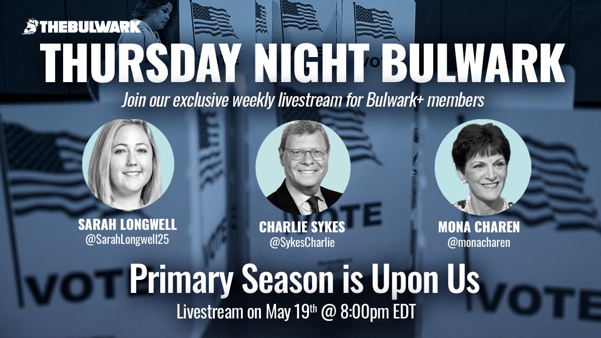 Bulwark+ TakesPrimary Season is Upon Us [5/19/22]Bulwark livestream for May 19May 19, 2022∙ Paid2524ShareSarah, Charlie and Mona lead this edition of Thursday Night Bulwark for May 19. They’ll discuss the results of the primary races so far and the political news of the day. This post is for paid subscribersJoinAlready a paid subscriber? Sign inPreviousNext