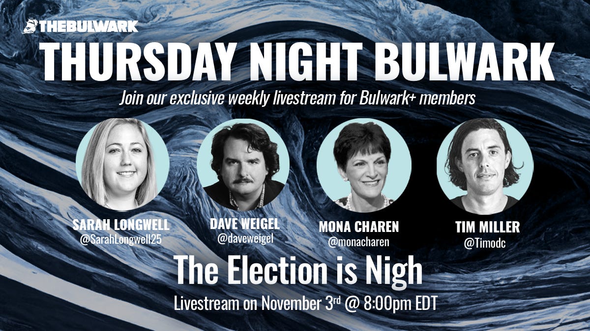 Special guest Dave Weigel joins Sarah, Mona, and Tim for this edition of Thursday Night Bulwark, recorded 11/3/2022.