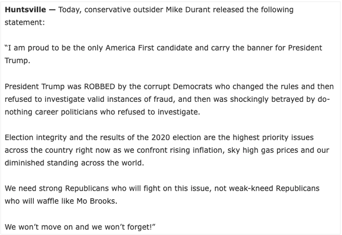 There is also the moral price that has to be paid for Trump’s favor. Here is the statement from Alabama senate candidate Mike Durant, issued within minutes of Trump’s divorce from Mo Brooks.