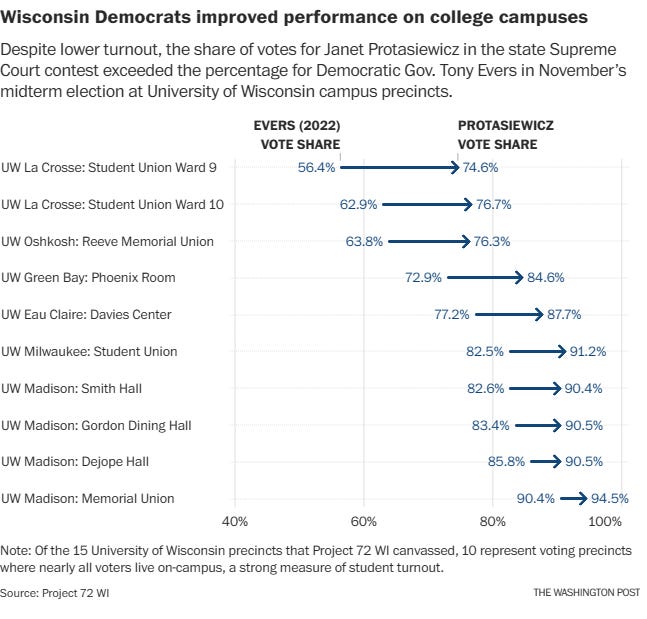 Fascinating analysis in the Wapo of how Democrats turned out college-age voters in last week’s state Supreme Court race. Look at this stunning graphic: