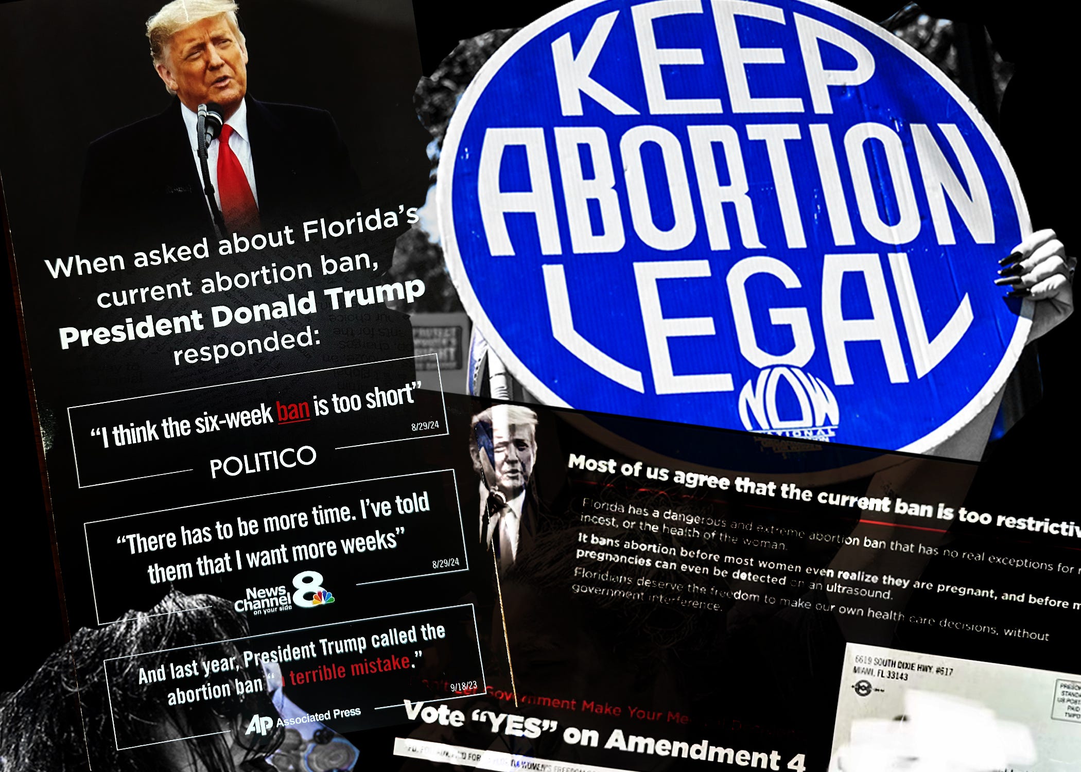 Those Trump comments, along with other remarks he made in opposition to the ban last year, are splashed in large, white type on the 250,000 black mailers sent earlier this month by the Florida Women’s Freedom Coalition to Republican and conservative-leaning independent voters.