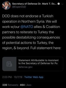 A few hours later, President Trump's Secretary of Defense, Mark Esper, weighed in in a since-deleted tweet: