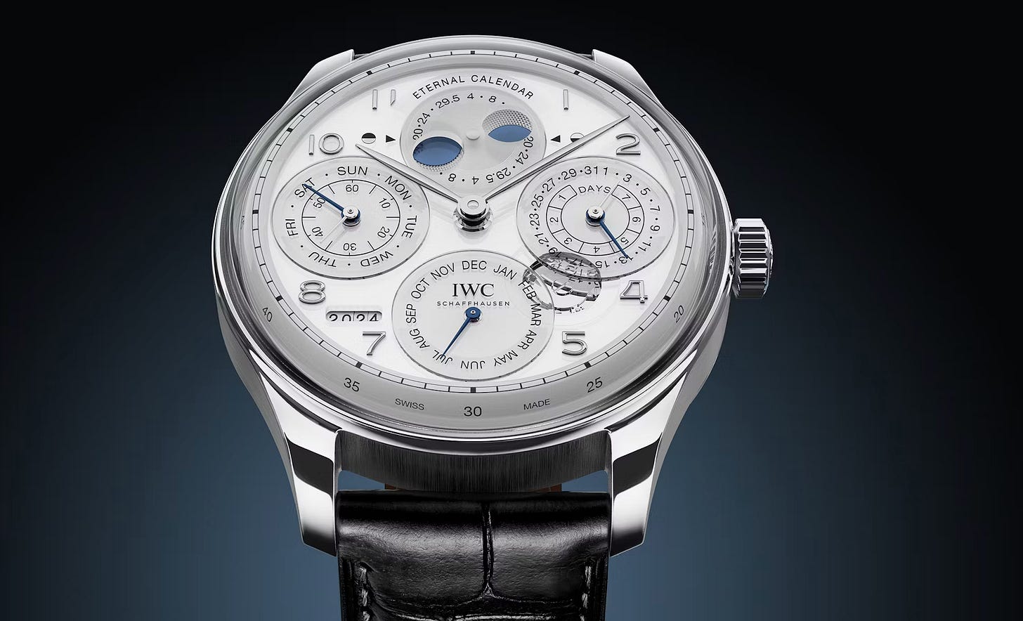 IWC calls it an “eternal calendar.” It’s like a perpetual calendar—meaning that the watch knows what day of the month it is, even on leap years—but better. Most perpetual calendars need to be adjusted every century. This calendar function doesn’t need adjustment for 400 years.