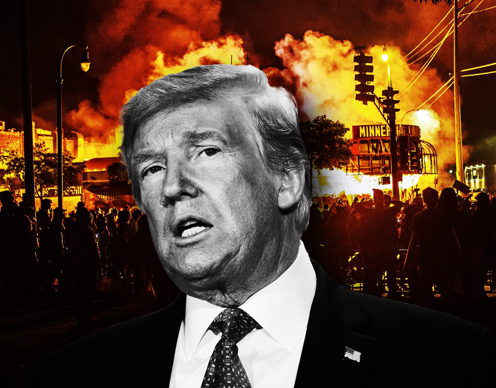 Protesters gather around a liquor store in flames near the Third Police Precinct on May 28, 2020 in Minneapolis, Minnesota, during a protest over the death of George Floyd, an unarmed black man, who died after a police officer kneeled on his neck for several minutes. - A police precinct in Minnesota went up in flames late on May 28 in a third day of demonstrations as the so-called Twin Cities of Minneapolis and St. Paul seethed over the shocking police killing of a handcuffed black man. The precinct, which police had abandoned, burned after a group of protesters pushed through barriers around the building, breaking windows and chanting slogans. A much larger crowd demonstrated as the building went up in flames. (Collage by Hannah Yoest / photos: KEREM YUCEL/AFP /GettyImages)