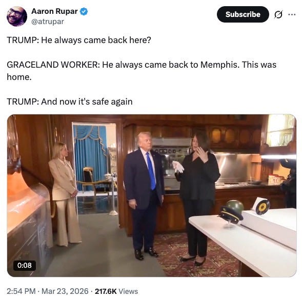 In this high-stakes moment, how did Trump choose to spend his Monday? With a jaunt to Memphis, Tennessee, to brag about his record on crime, tell a bunch of long, meandering stories, and visit Elvis Presley’s home at Graceland. If any of the mullahs happened to catch the speech, it’s hard to imagine it left them shaking in their boots.