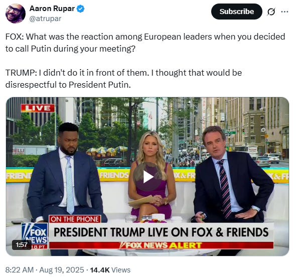 The Trump/Russia/Ukraine rollercoaster continues its dizzying ride. Right on the heels of the disgraceful Alaska lovefest between Trump and Putin—and the alarming signals of a new push for Ukraine’s surrender—Monday saw an apparent new pivot toward Ukraine as Trump met with Volodymyr Zelensky and a squad of European leaders at the White House. Under the circumstances, “it could have been much worse” counts as good news, especially when we remember the disaster of Zelensky’s last White House visit six months ago, in which he was hectored by a boorish Trump and a smug JD Vance.