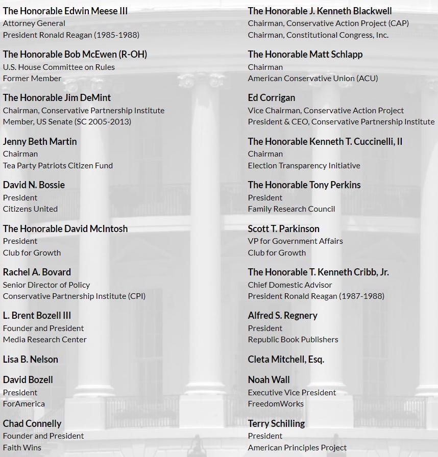 Here is just a partial look at the signatories. Those of you not immersed in GOP politics might not recognize many of the names, but they represent a cross-section of Conservatism Inc. — from former Reagan Attorney General Ed Meese to the Club for Growth to the Tea Party lady.