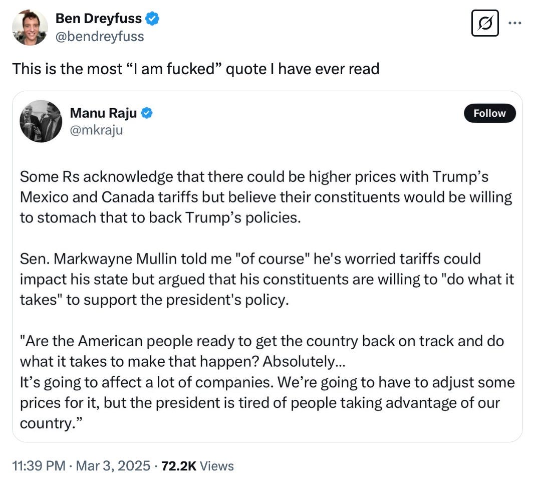 Still deeper abandonments of Ukraine! Slapdash DOGE cuts at the VA! Day one of our brave new economy-curdling trade war with Canada and Mexico! Strap in: It’s a big old overstuffed burrito of a Morning Shots today. Happy Tuesday.
