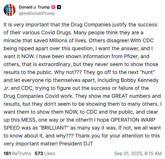 I love how the most powerful man in the world is just an interested bystander when it comes to pharma in general and vaccines specifically. The idea that HE, the President, couldn’t just share what the companies supposedly showed him is laughable. He shares state secrets regularly, but can’t be bothered to share the data that Pfizer has shown him? I mean, I understand that this is for the idiots who support him. The nut bags who want to take his greatest achievement (Warp Speed) away from him. And sadly, he does have to give it up. I wonder how much it hurts for him to have to give the thing that even Democrats give him lots of credit for?