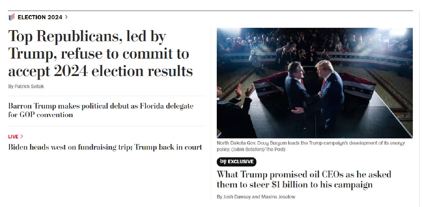 Now we have headlines like “Top Republicans, led by Trump, refuse to commit to accept 2024 election results.” And “What Trump promised oil CEOs as he asked them to steer $1 billion to his campaign.” And “Barron Trump makes political debut as Florida delegate for GOP convention.” Those three headlines above were lumped together at the top of the Washington Post homepage and phone app last Thursday: