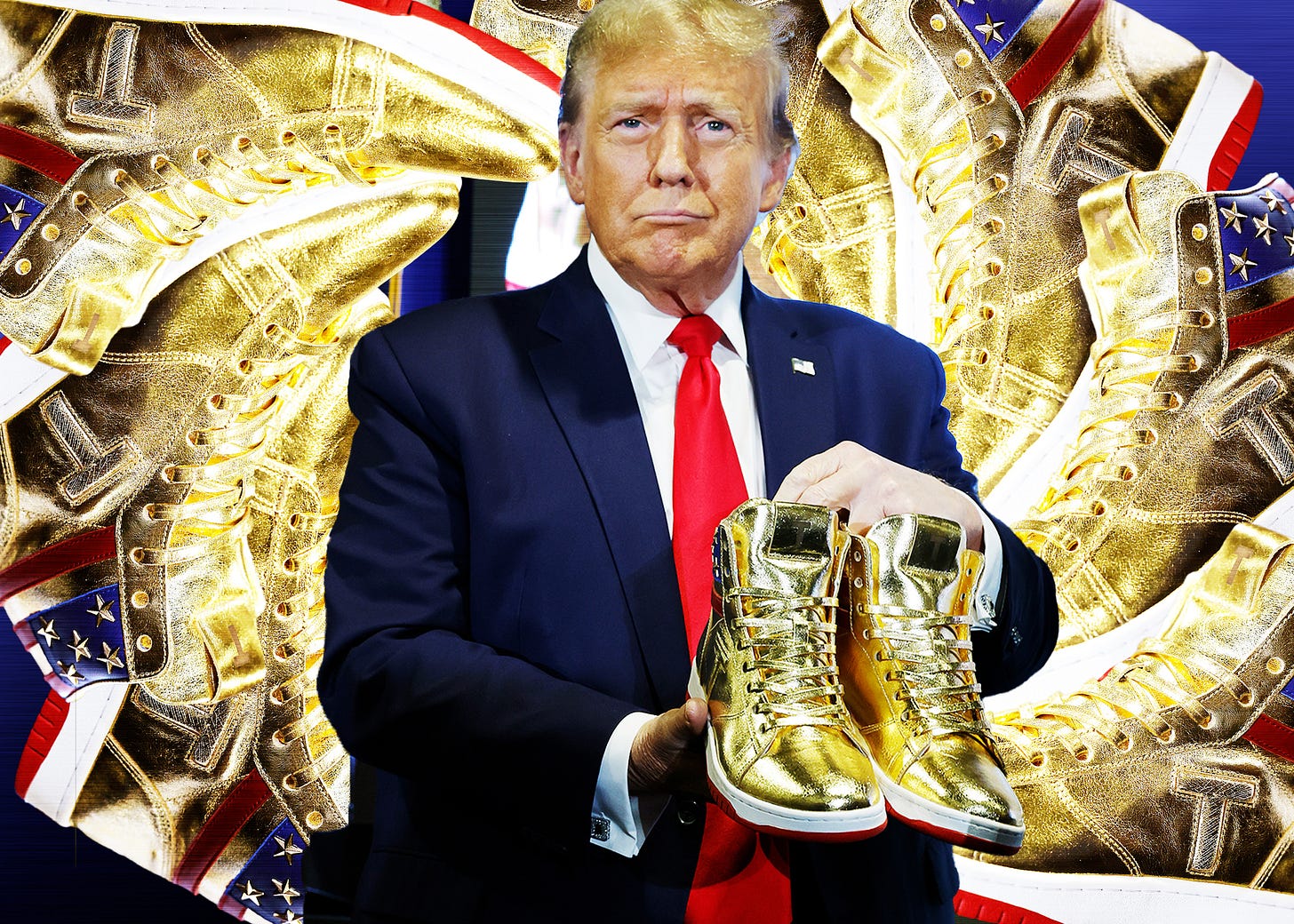 The team behind Trump’s MAGA Stan Smiths appears to have borrowed their design of the shoe from the waning days of the George W. Bush administration. The $399 gold “Never Surrender High Top Sneakers” are reminiscent of the Adidas high-tops designed by Jeremy Scott and popularized by rapper Lil Wayne during the late 2000s. Meanwhile, Trump’s other two sneakers—a $199 design that comes in red (“T-Red Wave”) or white (“POTUS 45”)—bring to mind the sock-style shoes that have been around for decades but took the sneaker market by storm in recent years thanks to innovative designs by Kanye West, the disgraced antisemitic rapper and producer whose long, fraught collaboration with Adidas changed the sneaker industry.