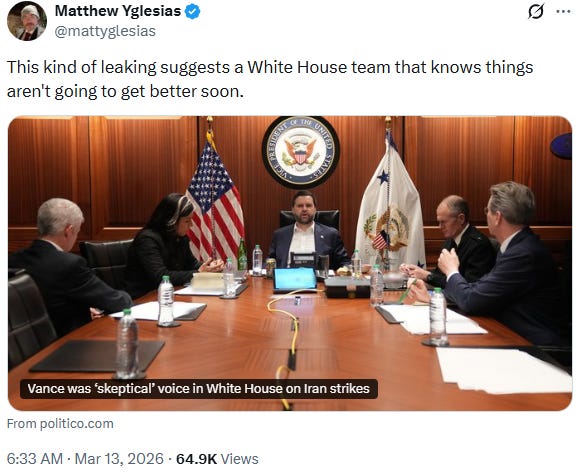 But couldn’t it be something of a political opportunity? Trump has taken us to war. The damage of his unilateral and irresponsible decision to do so is mounting, in terms of death and destruction in the Middle East, American casualties, and economic damage globally and at home. And it doesn’t look as if there’ll even be regime change in Iran. Trump’s war is a mistake heading towards disaster.