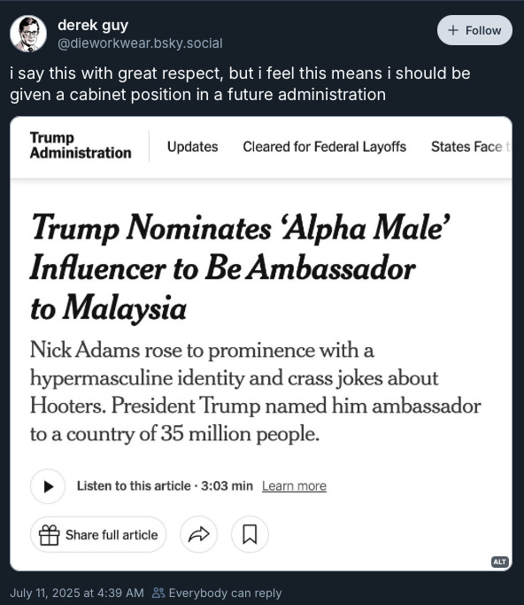 (3) If past is precedent, Patel likely won’t be in his job in a few years. Certainly the odds of him serving a full ten-year term are extraordinarily low. So are they gonna do a whole new round of polygraphs after the Senate confirms Catturd as FBI director in 2027?