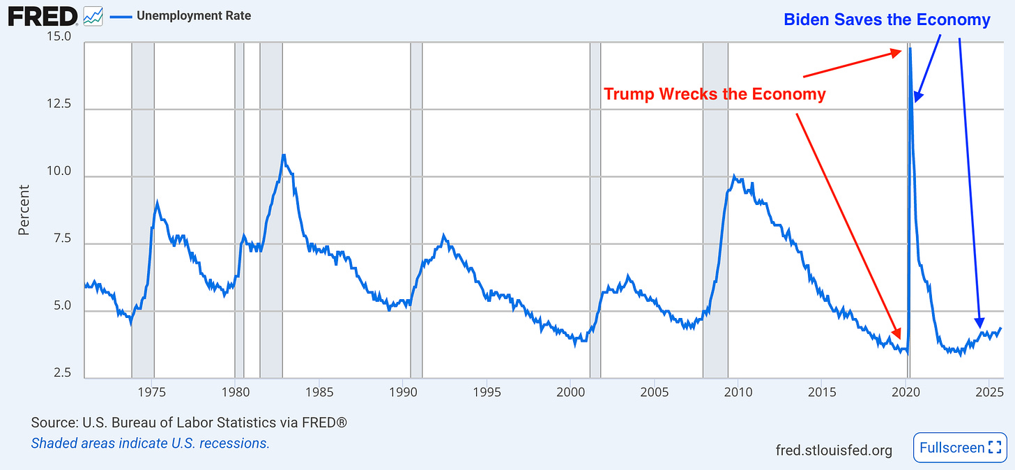 Under Donald Trump the unemployment rate went to almost 15 percent. That’s very bad. Biden brought it down to 3.5 percent and kept it there almost his entire term. That’s very good.