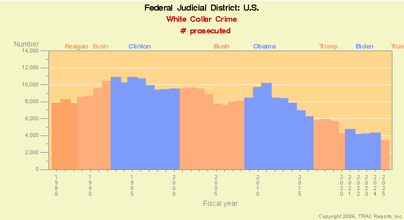 Now, in fairness, Justice Department white-collar prosecutions have been trending downward more or less since the 1990s, with occasional spurts of enforcement (such as right after the 2008 financial crisis). But the Trump administration just hit an all-time low in white-collar prosecutions this past fiscal year, according to data from the Transactional Records Access Clearinghouse.