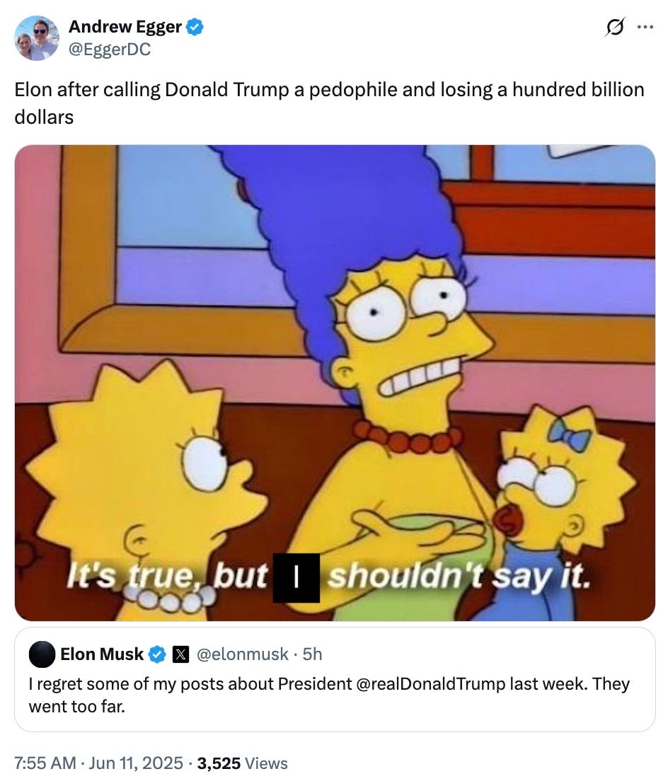 It’s unclear what early-morning intelligence Musk might have received to have made him reevaluate his former claims that Trump had been alarmingly close to Jeffrey Epstein and was now making the federal government cover that fact up. Must have been pretty convincing, though! Happy Wednesday.