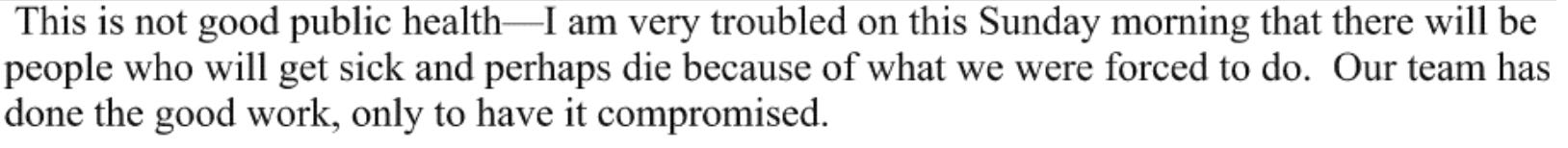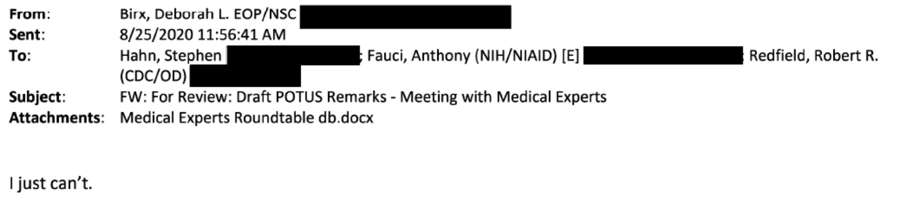 And a few hours after that, she forwarded the draft remarks to Fauci, Redfield, and Hahn with a one sentence note: