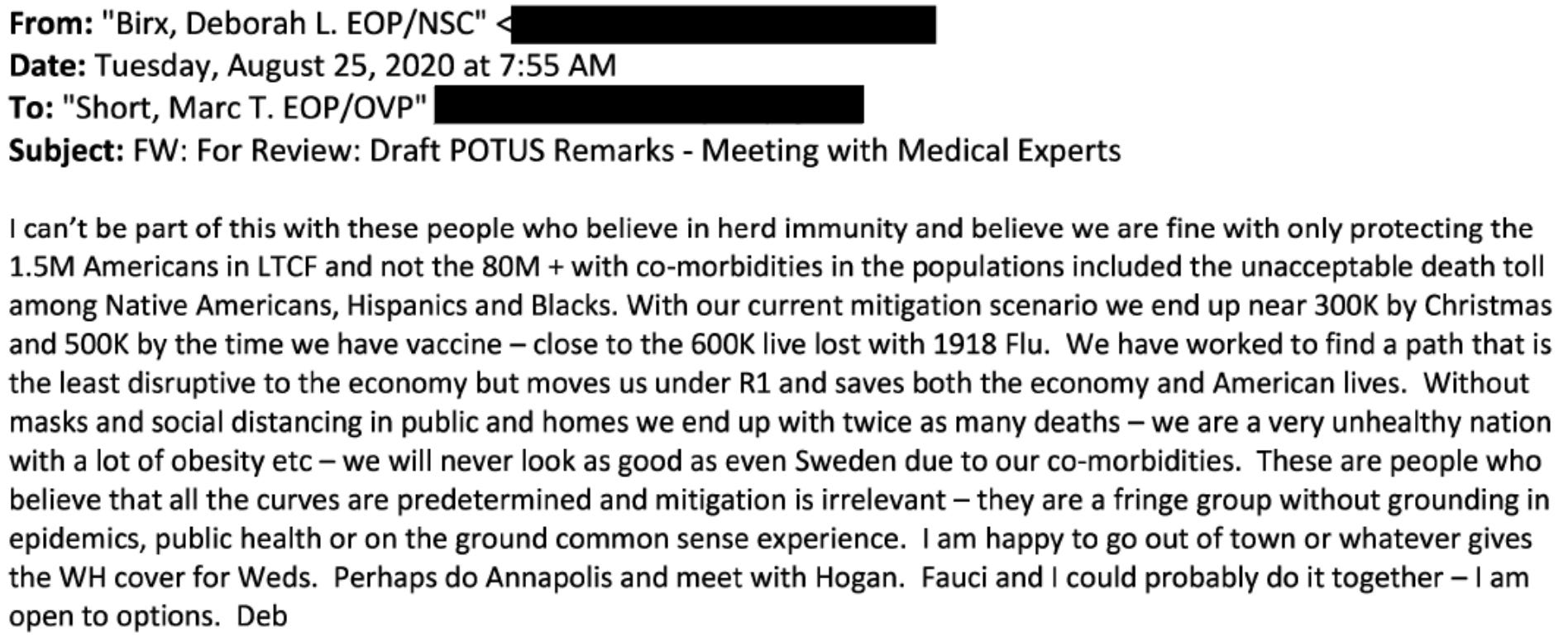 On August 24, 2020, the White House staff secretary sent out a copy of Trump’s remarks for the following day at an event with a group of herd-immunity quacks. Among the people copied on the email were Kayleigh McEnany, Jared Kushner, Hope Hicks, Scott Atlas, and Larry Kudlow.