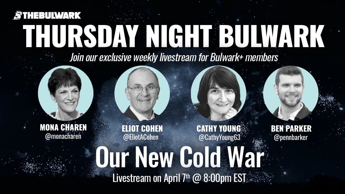 Mona Charen, Eliot Cohen, Cathy Young and Ben Parker join tonight’s edition of Thursday Night Bulwark to discuss the latest developments in the war in Ukraine, the west’s response and an isolated Russia. Welcome to our new Cold War.