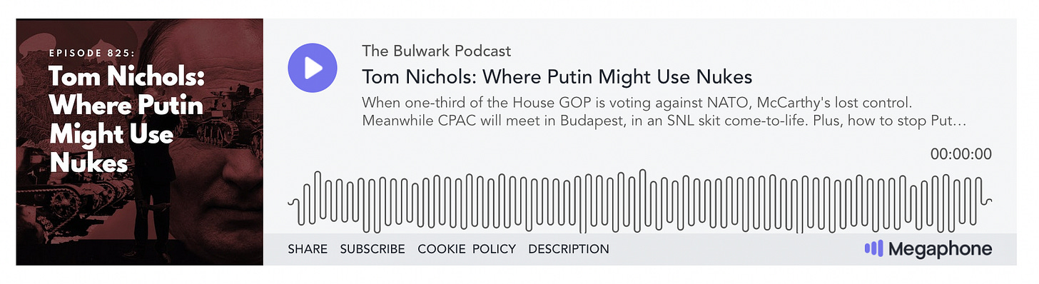 That’s it for me. Tech support questions? Email members@thebulwark.com. Questions for me? Respond to this message.