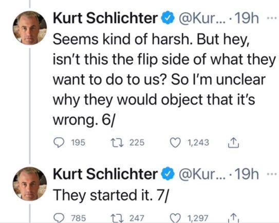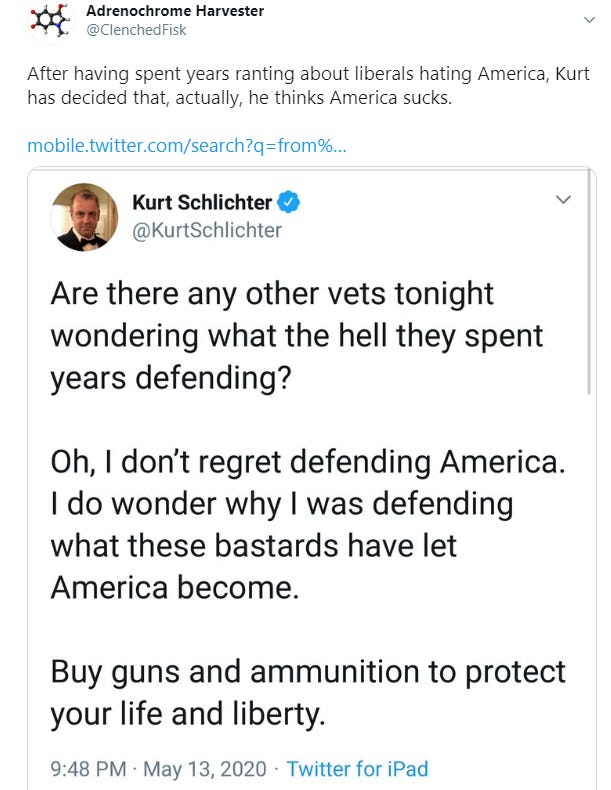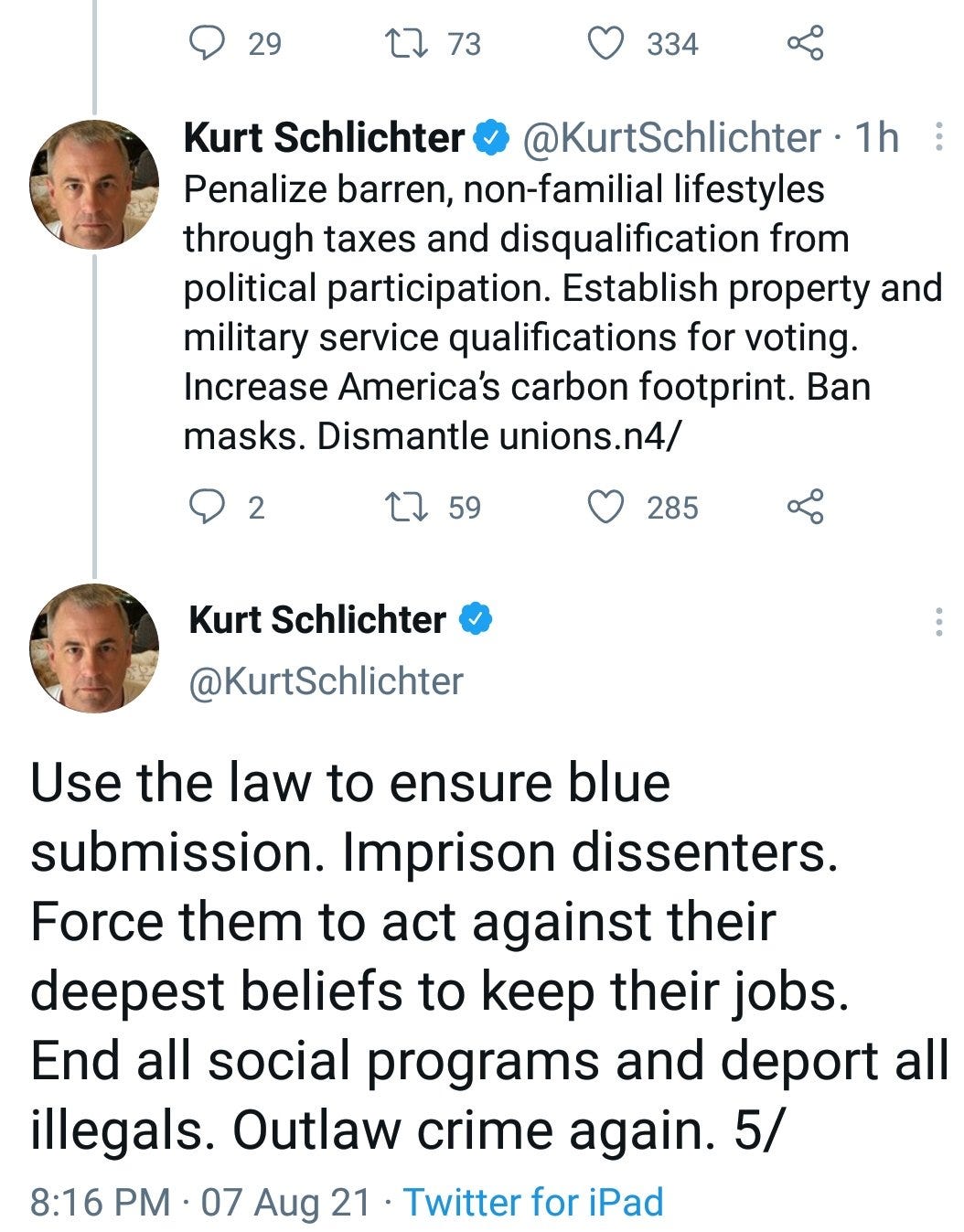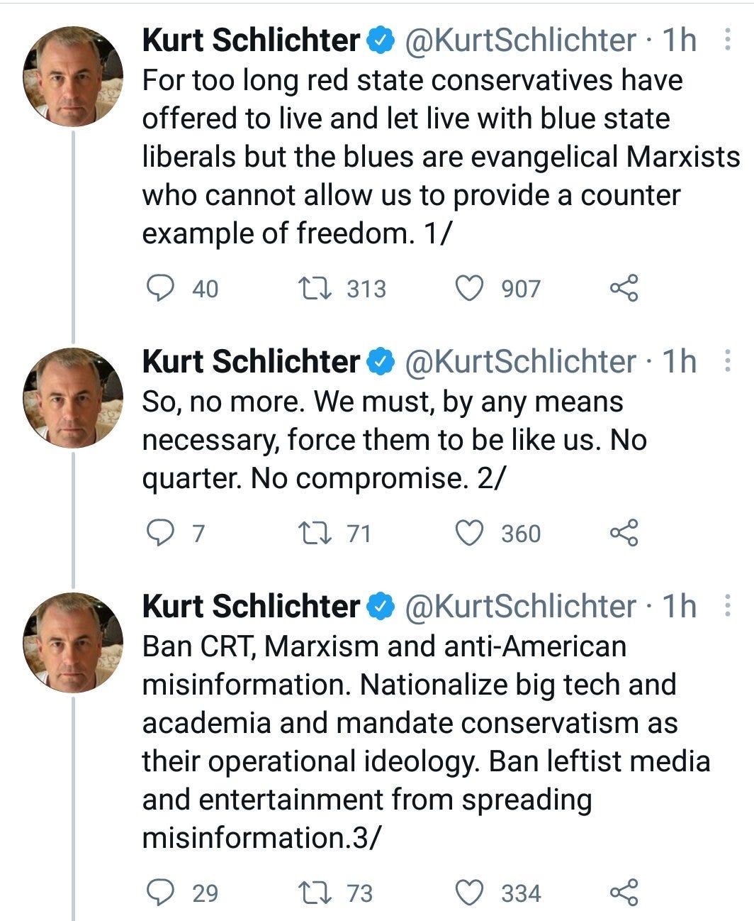 For a much rawer version of the right’s new Fascist Temptation, check out this thread from Kurt Schlichter. It’s worth noting that he is Hugh Hewitt’s backup radio host, a contributor to Townhall, and a featured guest on Fox News.