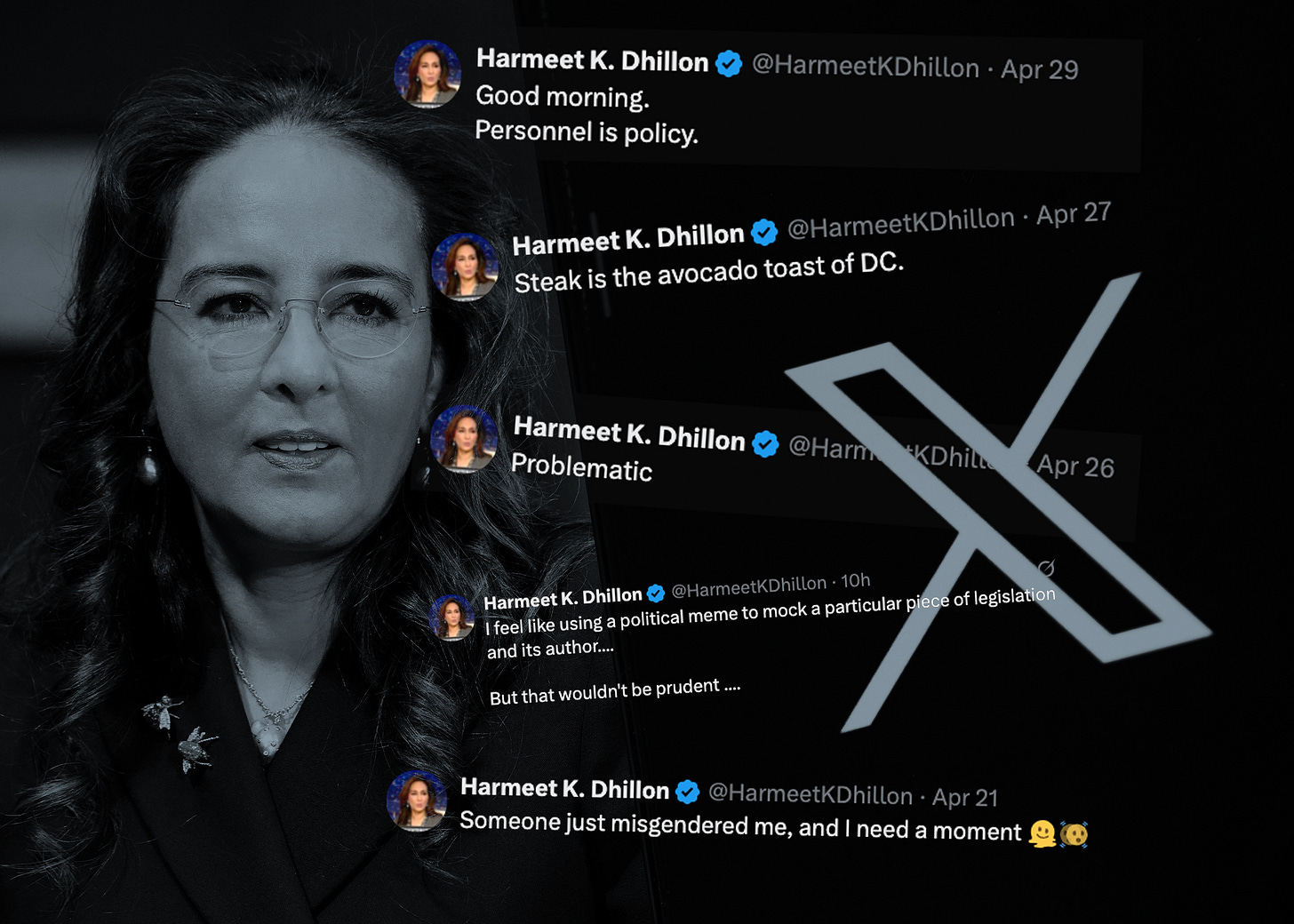 Since being sworn in on April 8, Dhillon, from her personal account, has tweeted 263 times, or 11.9 times a day, not counting things she’s retweeted. As I wrote this newsletter, Dhillon tweeted once again, this time about when she bathed in a “sacred pool” in India. Ten minutes after that, and still very much during the workday, Dhillon tweeted about a political meme she wanted to post—“But,” she cautioned herself at 3:01 p.m. on a Wednesday, “that wouldn’t be prudent.”