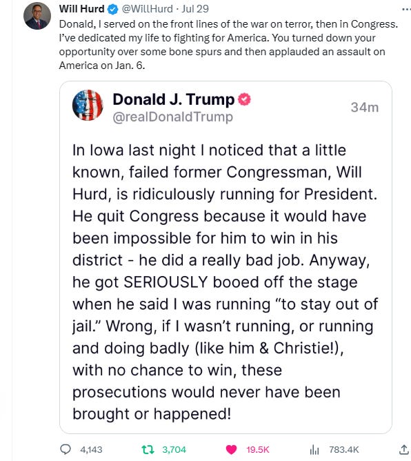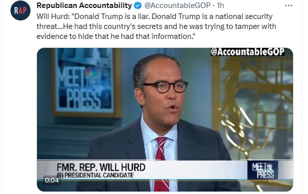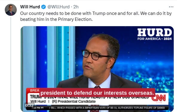 In the interest of full disclosure, my colleagues here at the Bulwark have been hard on Will Hurd. You can read Tim here: “Will Hurd’s Dangerous Wishcasting,” and JVL here: “Good Will Hurd Running.” (“Will Hurd is running for president and this is a bad thing. Let me explain.”) JVL returned to Hurd yesterday: “There Is a Hidden Danger in Trying to Convince Republicans to Vote Against Trump in the Primaries.” You should read them all, because they make valuable and thoughtful points.